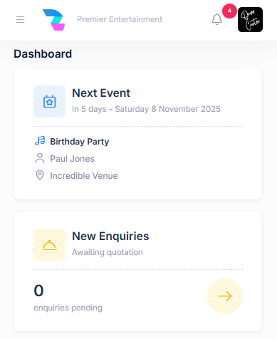 Keep track of every enquiry, event, and contract in one place. Create quotes, confirm gigs, and send automatic reminders — all from your dashboard.