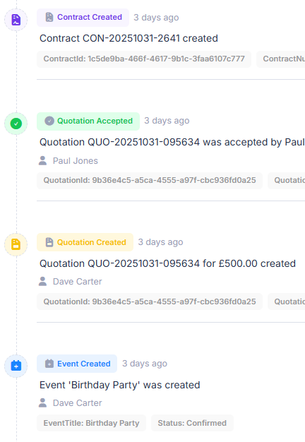 View full change and interaction history on every event! Keeping track of when events were created, contracts were sent, and invoices paid!