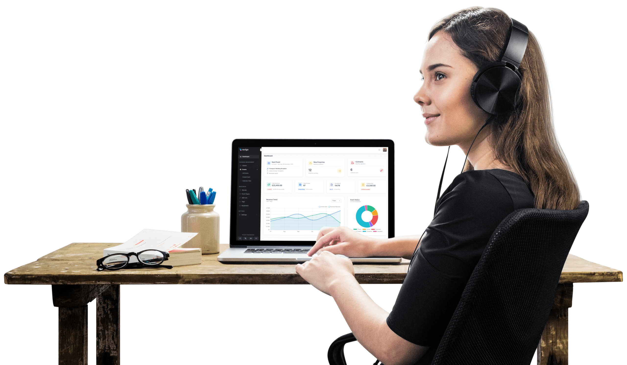 Raviga was not built by a marketing team or a venture capital fund. It was built by a performer who got sick of the admin. Every feature exists because a real working entertainer needed it. That means proper contracts with e-signature, real invoicing without needing a third-party subscription, equipment tracking that goes down to serial number level, and a communication history that keeps every email against every booking.